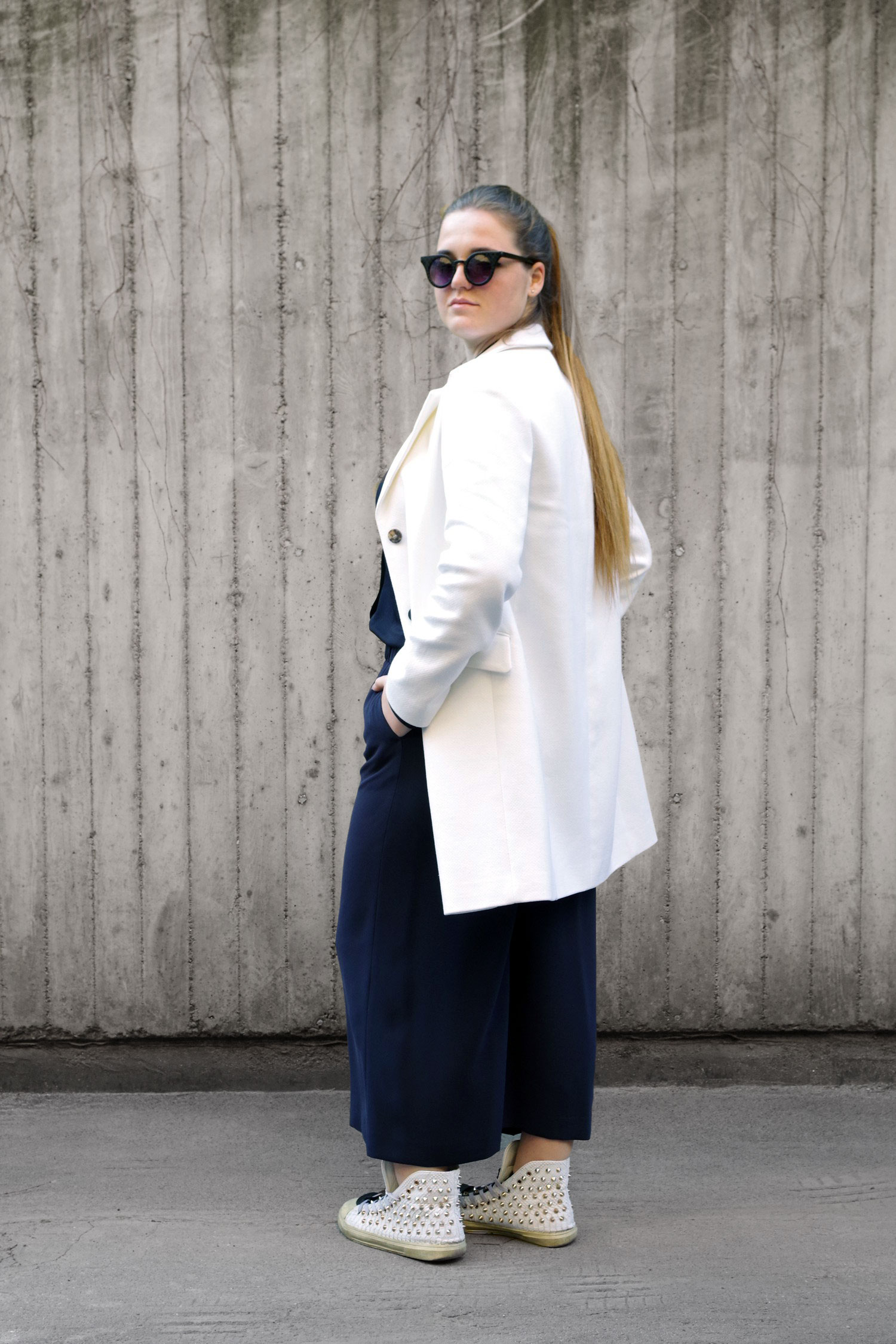 Caban bianco doppio bottone e pantaloni palazzo alla caviglia