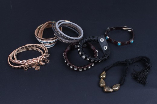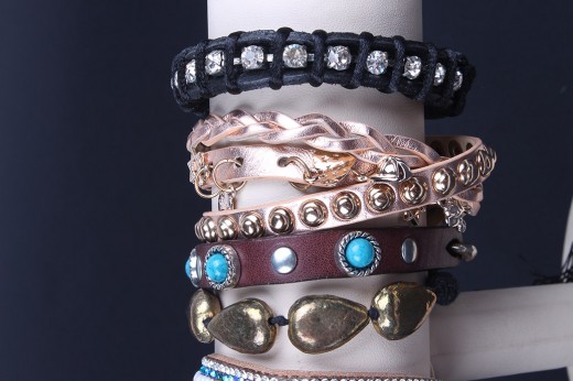 Bracciali in pelle e tessuto con punti luce stile tennis e fibbia brunita Fili di cuoio colorati e fiocchi di tessuto si alternano alle catene in lega di metallo arricchite da pepite dorate e ciondoli abbinabili a collane ed orecchini