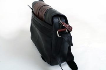 Messanger bag (due pezzi) in pelle nera e cuoio marrone 36x28x10 con chiusura a “postino” e lunga tracolla (patella a tutta larghezza) doppio vano con chiusura a cerniera, interno scamosciato con varie taschine