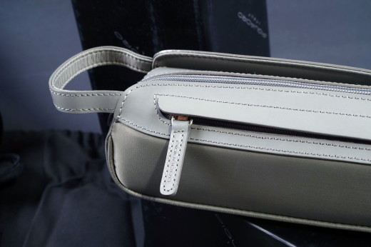 Pochette da viaggio o Astuccio porta oggetti unisex in elegante pelle mista a tessuto tecnico grigio piombo Due modelli di forma cilindrica con cerniera frontale o cerniera sulla parte posteriore e pratica maniglietta laterale