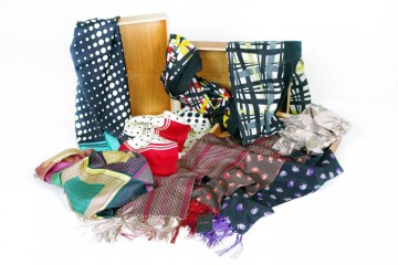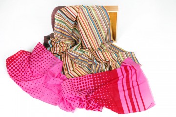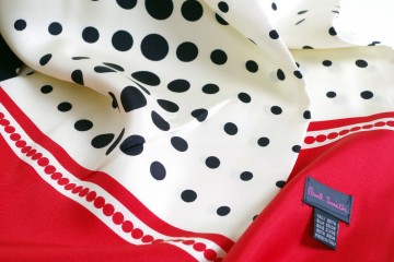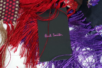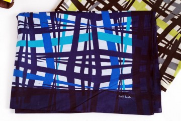 Paul Smith : maxi foulards in cotone con la tipica fantasia rigata mille colori, sciarpine e foulards in seta e chiffon di seta sia per Lei che per Lui (fantasie a pois e fantasie astratte)