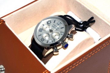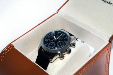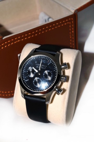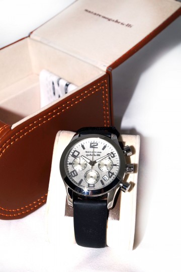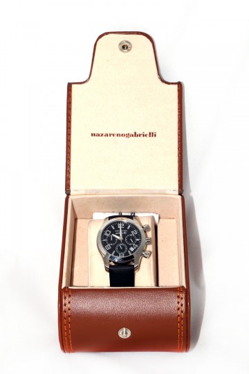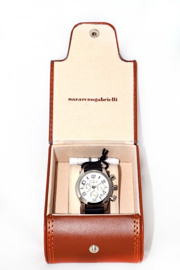 Cronografo N. Gabrielli a cassa tonda in acciaio con diametro cm 3,5 Cinturino in pelle nera in entrambe le versioni: quadrante grigio perla o quadrante nero Le prestazioni del cronografo prevedono di cronometrare da un decimo di secondo fino ad un massimo di un’ora Elegante confezione in pelle