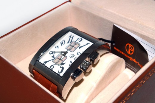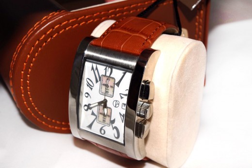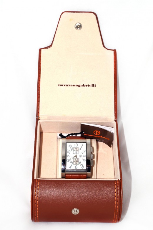 Cronografo N. Gabrielli a cassa rettangolare in acciaio (cm 3,5 x cm 4,5) Cinturino in cuoio stampato coccodrillo nella versione con quadrante color avorio e numerazione ben visibile Elegante confezione in pelle