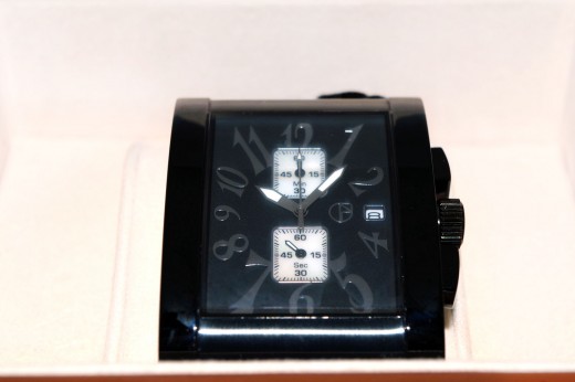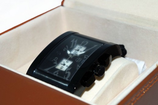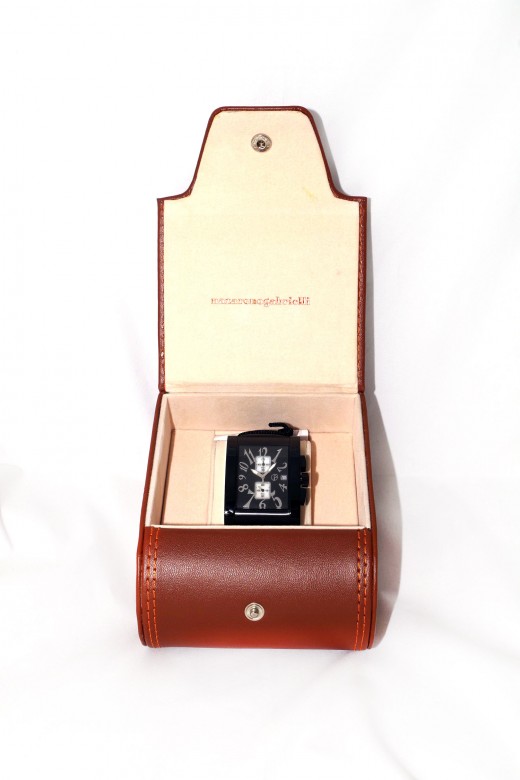 Cronografo N. Gabrielli a cassa rettangolare in acciaio tinto nero (cm 3,5 x cm 4,5) Cinturino in pelle nera stampata effetto coccodrillo nella versione con quadrante nero Numeri e lancette ben visibili Elegante confezione in cuoio