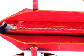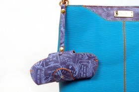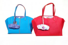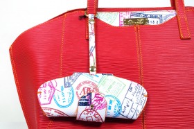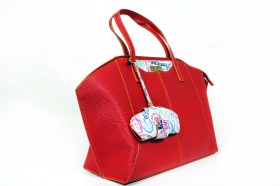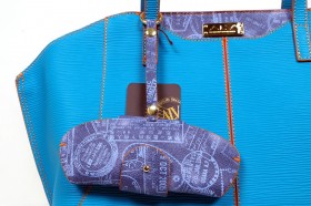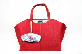 Borsa a due manici con chiusura a cerniera e pratiche taschine interne  Proposta in due colori : rosso con finiture e portaocchiali abbinato in fantasia passport bianco; turchese con impunture arancio e finiture e portaocchiali in passport denim