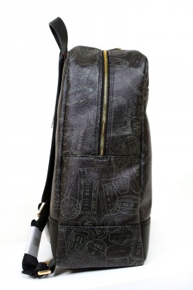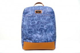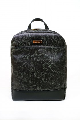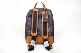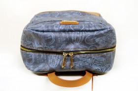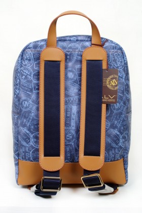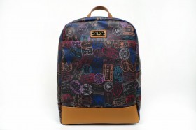 Zaino in cuoio e PVC con vano interno porta pc e pratiche taschine portoggetti  spallacci rinforzati in tessuto di nylon blu rivestiti in cuoio regolabili  Proposto in tre colori : fantasia passport denim con finiture in cuoio; fantasia passport nero con finiture in cuoio tinto nero; fantasia passport marrone con finiture in cuoio