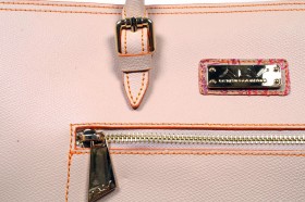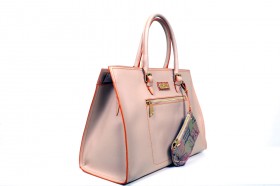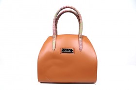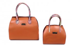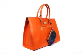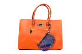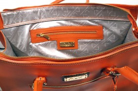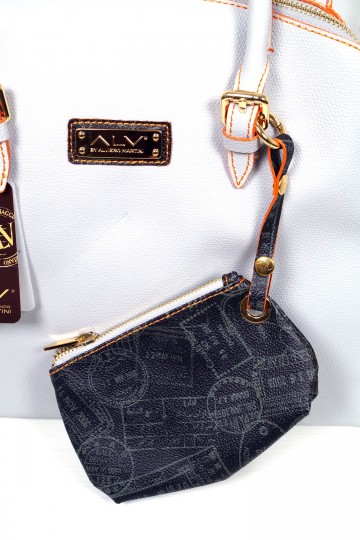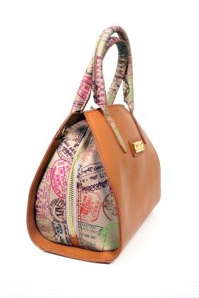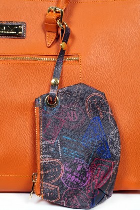 Borsa a mano a due manici con chiusura a cerniera, pratica tasca esterna e varie taschine interne  Proposta in due colori : sabbia con impunture arancio e pochette abbinata in fantasia passport safari; arancio con impunture a tono e pochette passport marrone