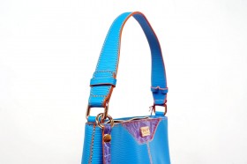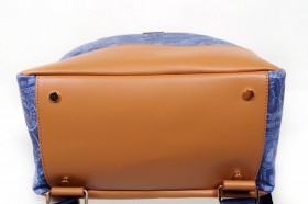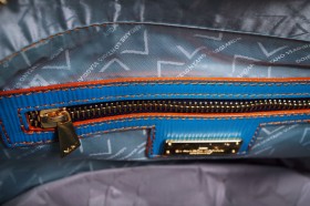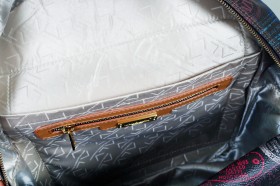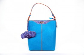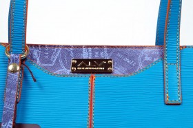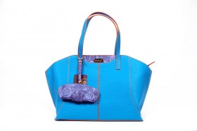 Borsa verticale ad un manico con chiusura a cerniera e pratiche taschine interne  Proposta in turchese con impunture a contrasto  Finiture e portaocchiali abbinato in fantasia passport denim