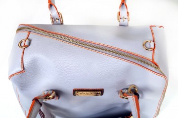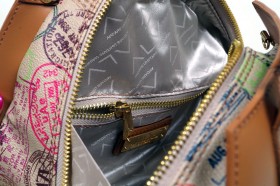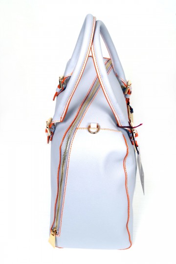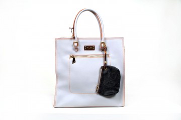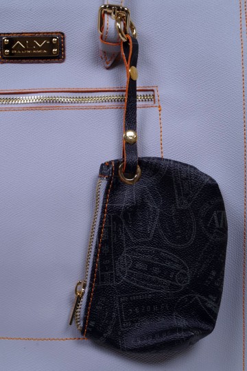 Borsa a due manici con pratica tracollina applicabile, cerniera asimmetrica e comode taschine interne  Proposta in due colori: grigio polvere con impunture arancio e pratica pochette in fantasia passport nero; sabbia con impunture arancio e pochette in fantasia passport safari