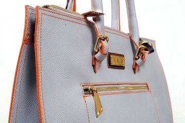 Borsa verticale a due manici con chiusura a cerniera tasca esterna e comode taschine interne  Proposta in grigio polvere con impunture arancio e pochette abbinata in fantasia passport marrone