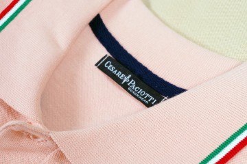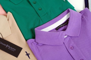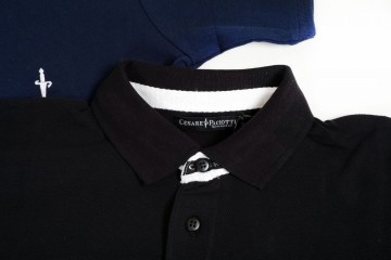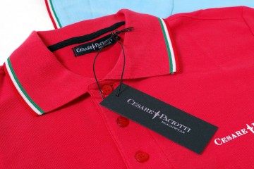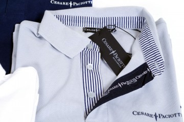 Nuovo lotto di 400 polo firmate C. Paciotti : 100 % cotone in vari colori tinta unita (bianco, blu, grigio, salmone, beige, rosso, lilla, nero, …) e differenti finiture di collo : tono su tono, bordo con fascetta a bandiera e rigato bicolore Piccolo logo dello stilista ricamato sul petto Vestibilità regolare dalla tg S alla tg 2XL