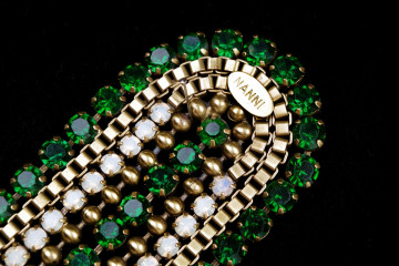 Girocollo in metallo e 115 carati di strass verde smeraldo, bianco opale e cristallo con bracciale abbinato in verde o arancio