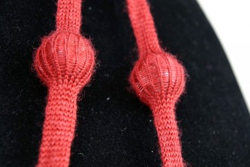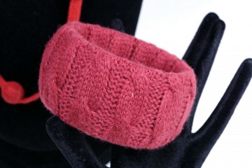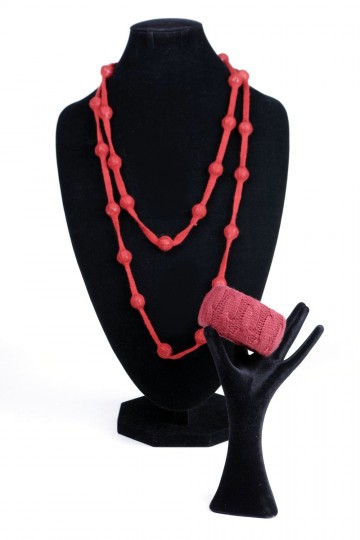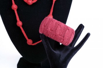 Collana lunga con boulles ricoperte di sottile maglia di lana color vino e bracciale rigido abbinabile