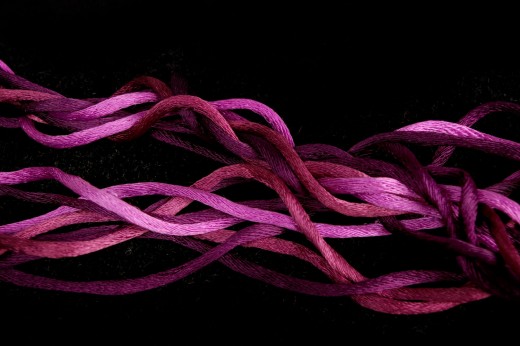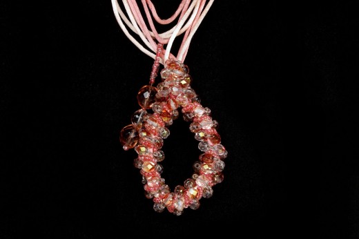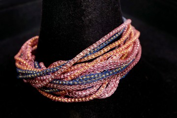 Collana in nastri di seta e perle di vetro lavorate a mano con inusuale chiusura ad anello