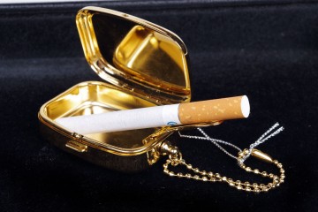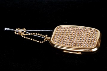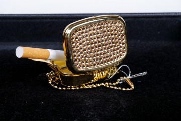 Posacenere da passeggio in metallo dorato e pavé di strass con apertura a scatto e comodo poggino per la sigaretta