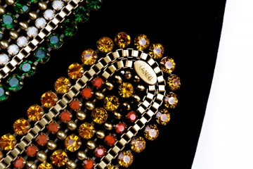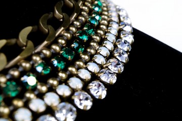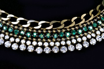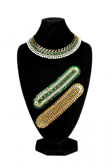 Girocollo in metallo e 115 carati di strass verde smeraldo, bianco opale e cristallo con bracciale abbinato in verde o arancio