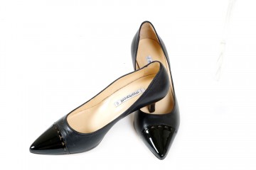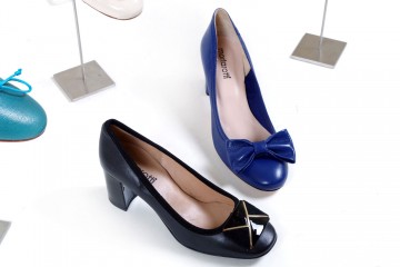 Décolleté alto con suola in cuoio e tacco (8, 10 o 12) rivestito in pelle tono su tono Modello tondo o a punta arrotondata con decoro bicolore, a drappo o a fiocco