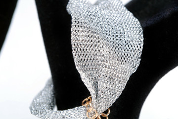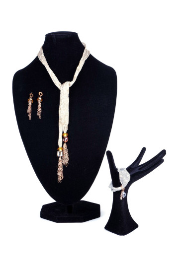 Parure Ippocampo in maglia “calza” dorata e argentata arricchita da nappine di catenelle in galvanica oro giallo e oro rosa e cristalli naturali