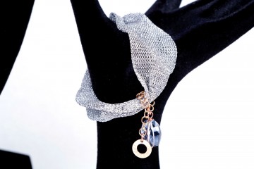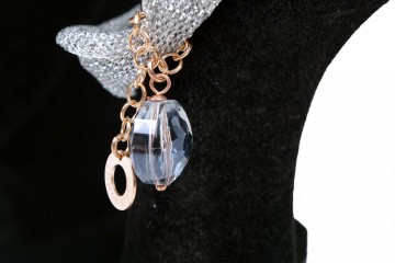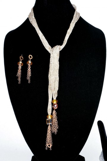 Parure Ippocampo in maglia “calza” dorata e argentata arricchita da nappine di catenelle in galvanica oro giallo e oro rosa e cristalli naturali