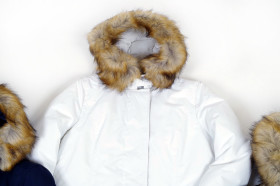 Parka lungo eco-imbottito e finitura del cappuccio in pelliccia ecologica disponibile nei colori bianco, blu e nero dalla tg S alla tg 2XL