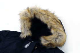 Doppia giacca scomponibile : cerata blu e piumino ecologico 100gr con rifinitura del collo in vera pelliccia giallo, arancio o blu