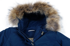 Parka lungo in vera piuma e cappuccio rifinito in pelliccia murmasky dalla tg S alla tg L in colore blu