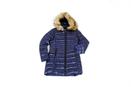 Cappottino imbottito in eco-piuma con collo rifinito in pelo ecologico e tessuto shell lucido blu, marrone e grigio fumo Dalla tg S alla 2XL (alcune taglie a numero ridotto)