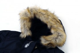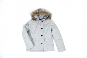 Parka corto con imbottitura in vera piuma e cappuccio rifinituo con pelliccia murmasky nei colori avorio, blu e nero dalla tg S alla tg 2XL