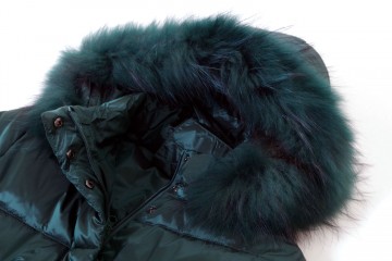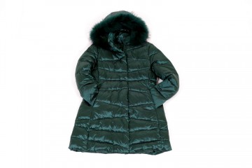 Cappotto imbottito in vera piuma con cappuccio rifinito in perlo murmasky nei colori verde ottano, marrone e nero dalla tg S alla tg 3XL (alcune taglie a numero ridotto)