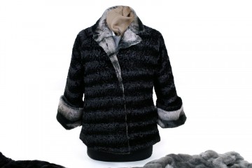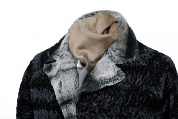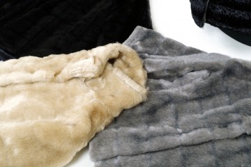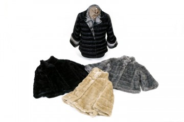 Pelliccette ecologiche in due modelli : taglio a trapezio nei colori beige, grigio e nero e modello classico in astracan grigio/nero