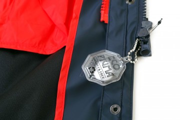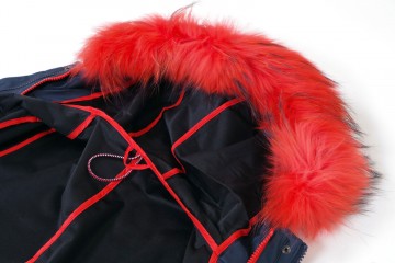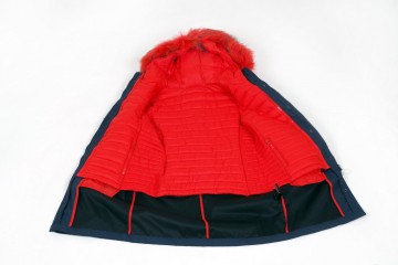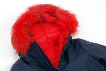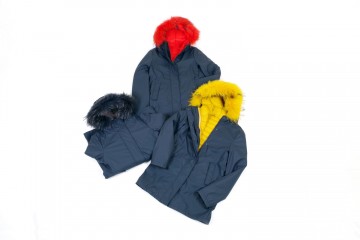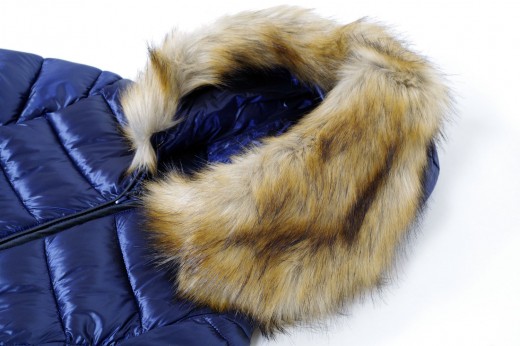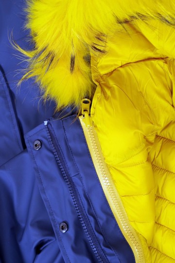 Doppia giacca scomponibile : cerata blu e piumino ecologico 100gr con rifinitura del collo in vera pelliccia giallo, arancio o blu