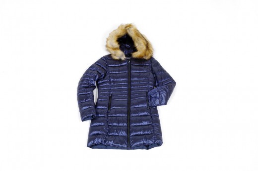 Cappottino imbottito in eco-piuma con collo rifinito in pelo ecologico e tessuto shell lucido blu, marrone e grigio fumo Dalla tg S alla 2XL (alcune taglie a numero ridotto)