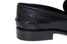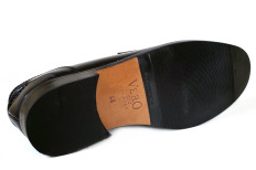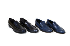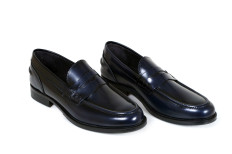 English Style, mocassino con o senza fibbie con suola in cuoio e cuoio/gomma in pelle nera, testa di moro, cuoio naturale e blu abrasivato.