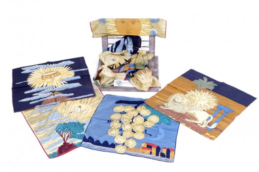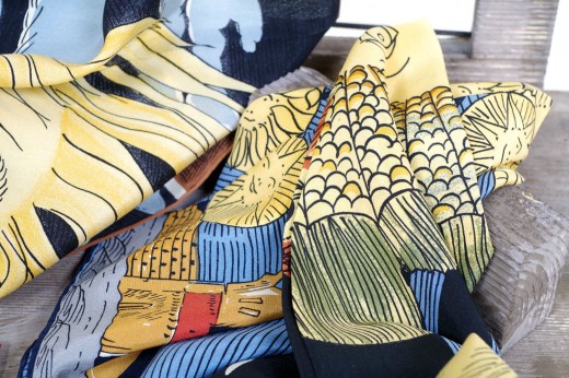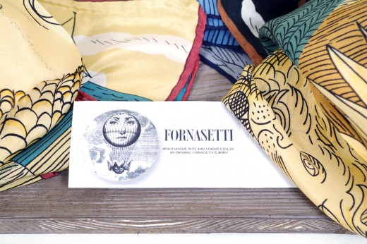Fornasetti : foulard da collo e pochette 50×50 disegnate a mano e prosposte in vari colori e temi (sole, leone, frutta, paesaggi,…)