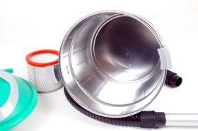 Bidone in acciaio della capacità di 18 lt motore 900w 230v 50Hz diametro cm 32 altezza cm 40 Tubo di aspirazione realizzato in acciaio rivestito con guaina in PVC con beccuccio cilindrico in alluminio anodizzato e studiato per raggiungere anche gli angoli più difficili