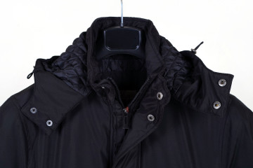 Parka nero in tessuto shell opaco ed imbottitura ecologica, cappuccio separabile, 2 tasche applicate e due a taglio obliquo, con doppia chiusura a zip nascosta e automatici