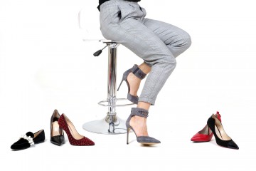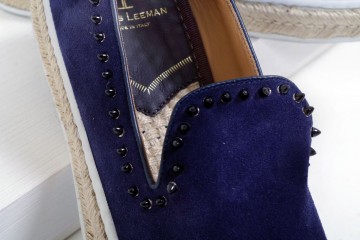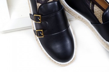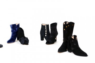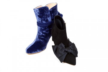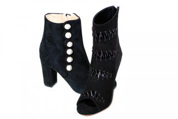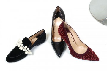 Decolletè modello stiletto in pelle nera semilucida o in velluto di cotone e mocassino modello pantofola in pelle scamosciata impreziositi da perle e borchiette dorate
