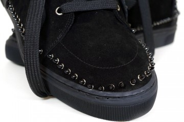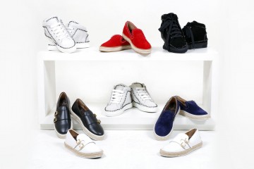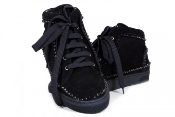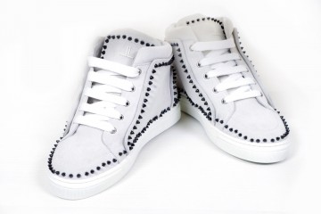 Slip-on e sneakers alte realizzate in pelle lucida e scamosciata, con suola in gomma antiscivolo e decorate con fibbie o borchiette colorate