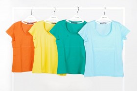 T-shirt 100% cotone pettinato, jersey di cotone o piquet con scollo a V (blu, bianco) o scollo profondo (arancio, verde smeraldo, verde mela, rosa, azzurro, giallo)