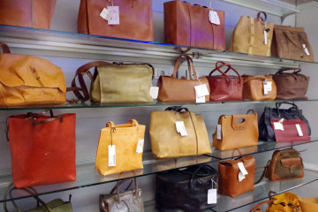 Borse, borsette, pochette, cartelle e borsoni da viaggio quasi unicamente pezzi unici Varietà di colori a tinta unita ma sempre nel rispetto della base in cuoio naturale : sabbia, cammello, cuoio naturale, bruciato, testa di moro, senape, arancio, porpora, verde foresta, blu e nero