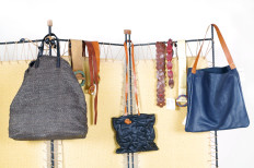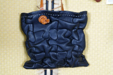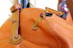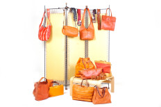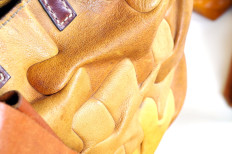 ARANCIO, ALBICOCCA, ARAGOSTA, CAROTA con decorazioni in pelle trapuntata, inserti di tessuti grezzi di canapa, lino e cotone, tinte a fantasie batik e sovrapposizioni bicolore