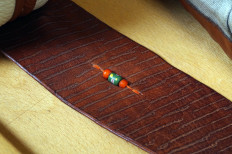 CUOIO SCURO impreziosito da minuterie in pietre naturali e animali, ambra grezza e ambra contaminata, turchese, lapislazzulo, malachite, conchiglia, corno, vetro grezzo e colorato