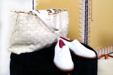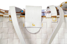 BIANCO, GHIACCIO, AVORIO in morbida pelle nappata, liscia o martellata, cuoio strutturato in forme plastiche, rifiniture in cuoio naturale, tessuti in canapa drappati o sormontati da intrecci di pelle, in vari modelli e dimensioni
