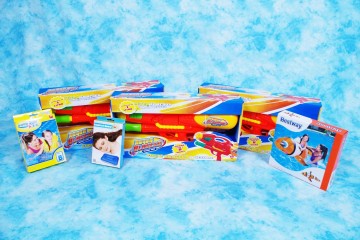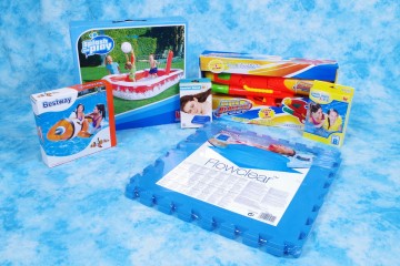 Teli mare, infradito e costumi per bimbo e bimba, piscina-pallavolo, mitra ad acqua, “nemo” gonfiabile, giubbottini di salvataggio e altri articoli per divertirci con i nostri bambini