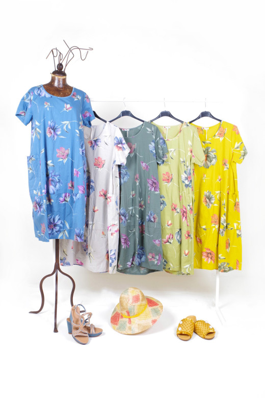 Articoli con manica corta o senza manica in vari modelli, tinte unite e fantasie con spennellate di colore, fiori, righe e pois: bianco, rosa, avorio, castagna, marrone, corallo, rosso, giallo, verde limone, verde militare, azzurro, carta da zucchero, blu e nero. Davvero un assortimento variopinto adatto ad ogni tipo di corporatura