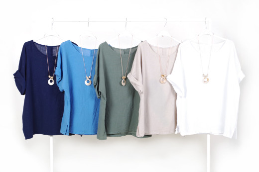 Casacche e bluse in lino e misto cotone con o senza manica con collo a barchetta, girocollo o collo a camicia dalla linea morbida e allungata