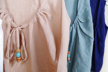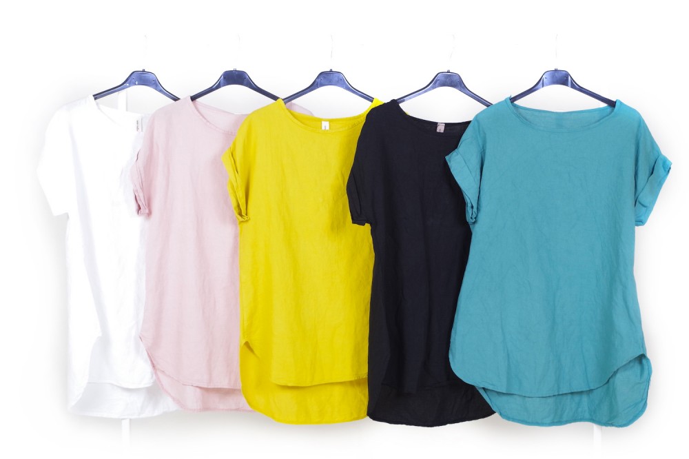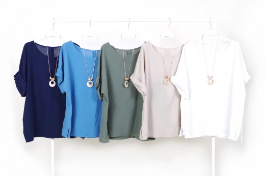 Casacche e bluse in lino e misto cotone con o senza manica con collo a barchetta,  girocollo o collo a camicia dalla linea morbida e allungata