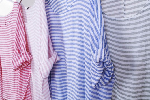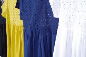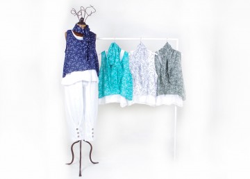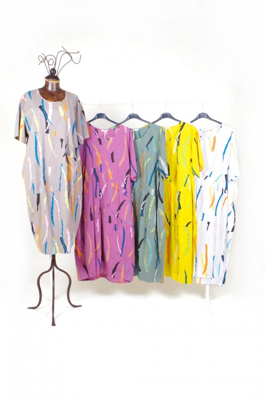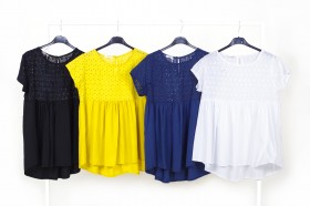 Articoli con manica corta o senza manica in vari modelli, tinte unite e fantasie con spennellate di colore, fiori, righe e pois: bianco, rosa, avorio, castagna, marrone, corallo, rosso, giallo, verde limone, verde militare, azzurro, carta da zucchero, blu e nero. Davvero un assortimento variopinto adatto ad ogni tipo di corporatura