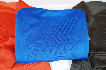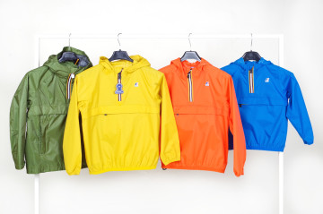 K-Way giubbino modello bomber con cappuccio, tasche laterali e tasca interna, maniche e vita arricciate, alcuni modelli reversibili. Proposti in tinta unita (bianco, beige, rosa, verde, blu, rosso, arancio) e fantasie floreali e geometriche.