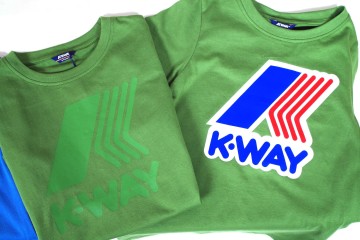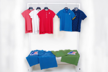 K-Way polo manica corta con colletto abbottonato in tinta unita (bianco, arancio, corallo, rosso, verde, blu) e bordi a contrasto. T -Shirt girocollo con logo stampato o ricamato a tinta unita (panna, giallo, verde, blu, arancio).